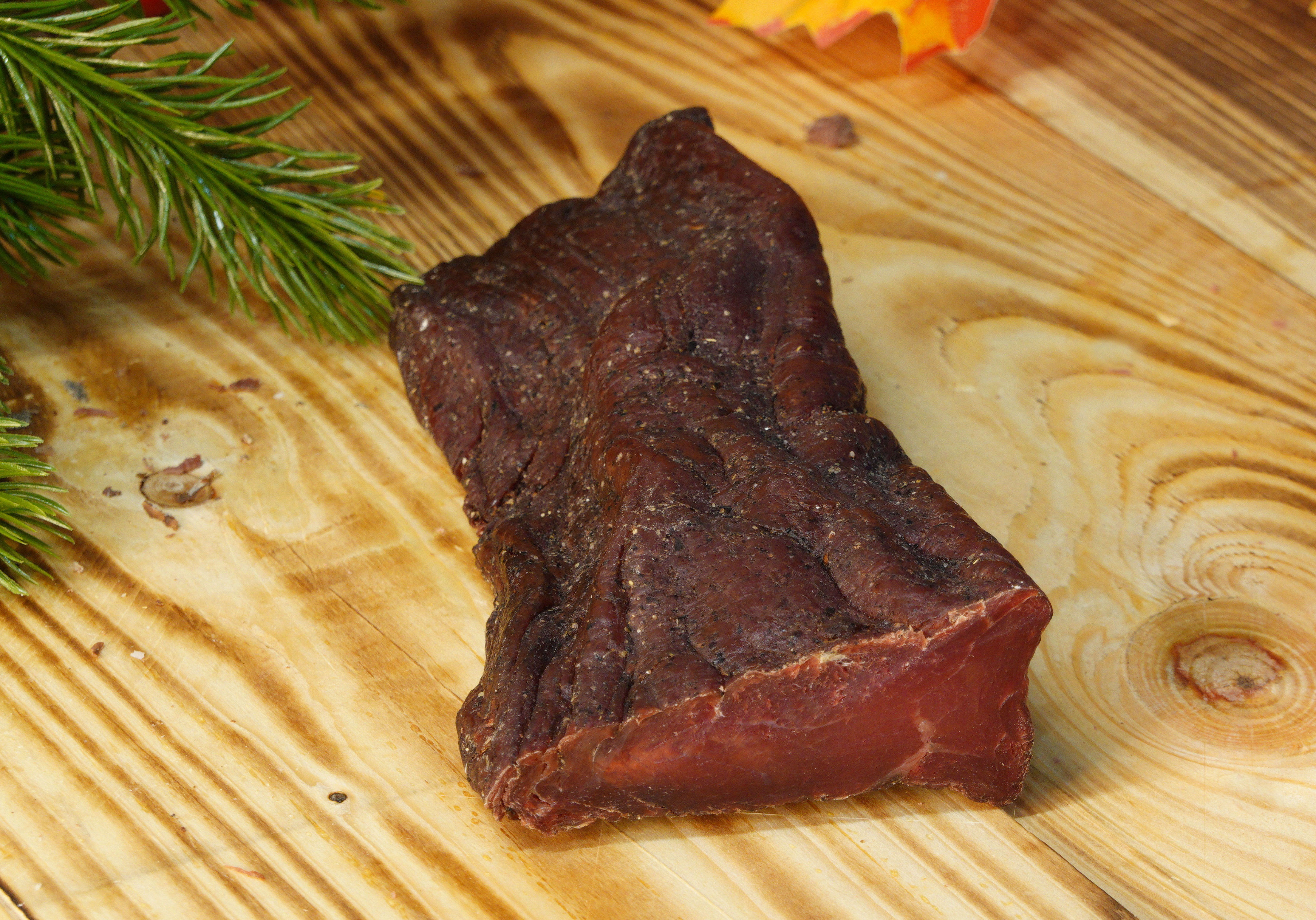 Конина сырокопченая изготовлена из лучших кусков вырезки домашнего животного. Мускатный орешек, черный молотый перец, можжевельник, кардамон, совсем немного шафрана и морской соли – естественные усилители вкусового букета непосредственно самого продукта. Конина быстро усваивается человеческим организмом – потребуется всего 3 часа. Говядина, к примеру, переваривается в течении суток. Постоянное употребление продукта – гарантия снижения уровня холестерина, нормализация функционирования ЖКТ.